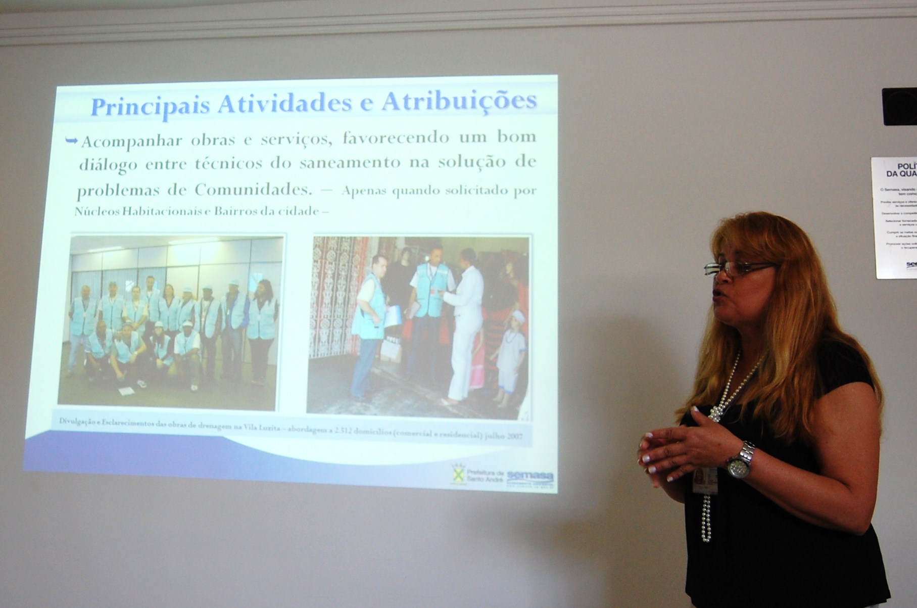 Lúcia, do setor de Relações Comunitários do Semasa, apresenta as atividades da autarquia municipal.