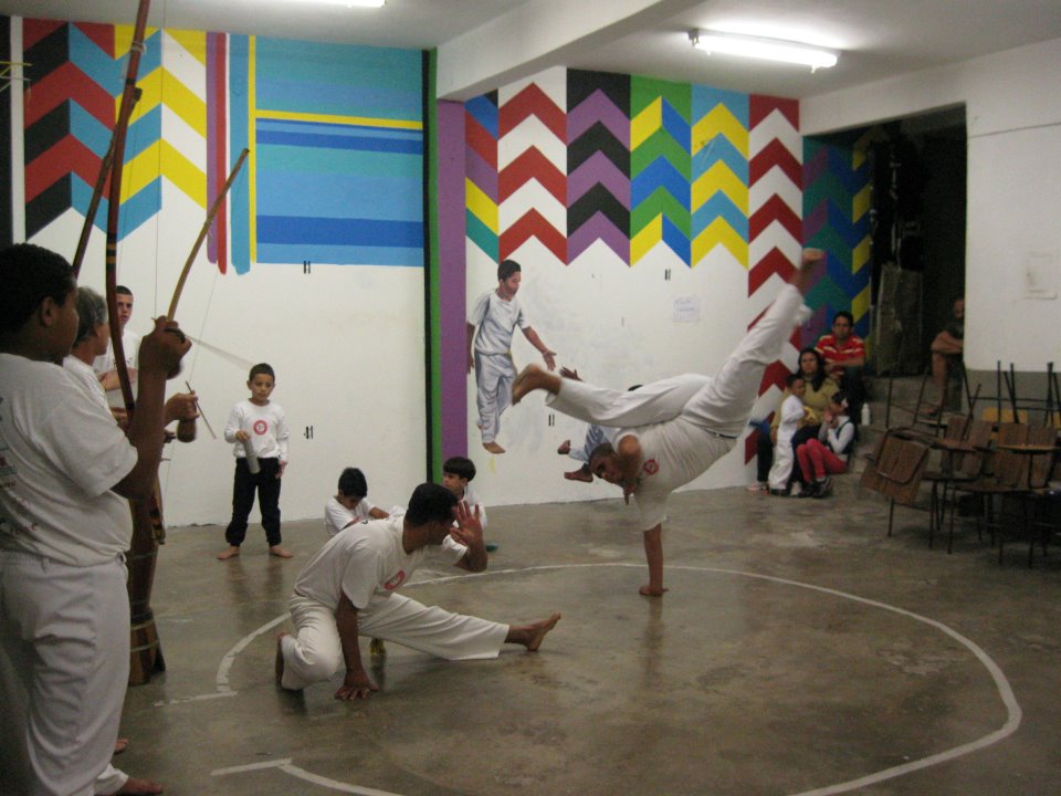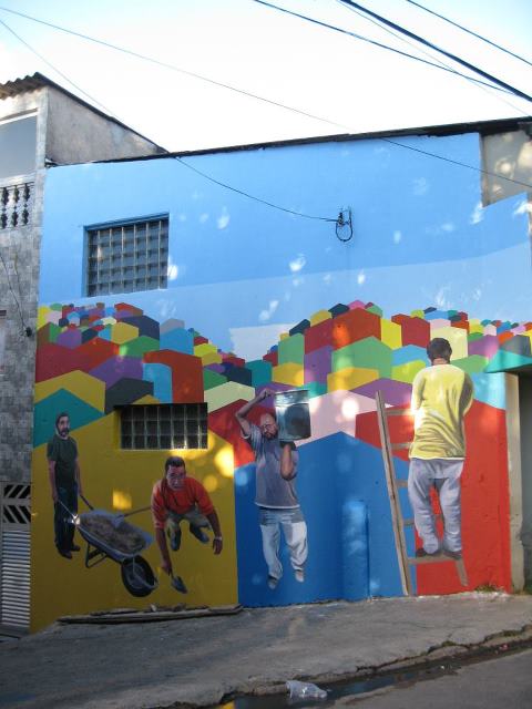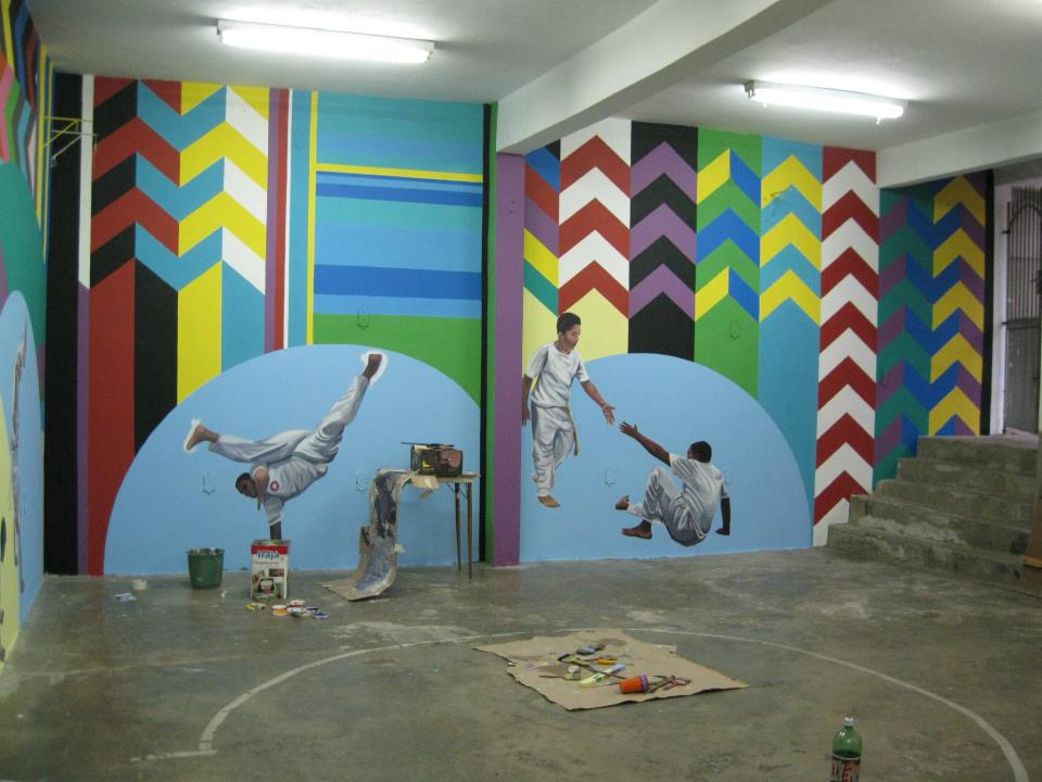 O artista explica que sempre atua em parceria com uma entidade local com o objetivo de “valorizar a identidade da comunidade e oferecer aos jovens, a oportunidade de participar da criação artística que reflete a história e a cultura local”. Os murais na Vila Gamboa, retratam o grupo de capoeira treinando e os mutirões de construção da sede da associação comunitária. A Gamboa, foi urbanizada no início da década de 90, em regime de mutirão.