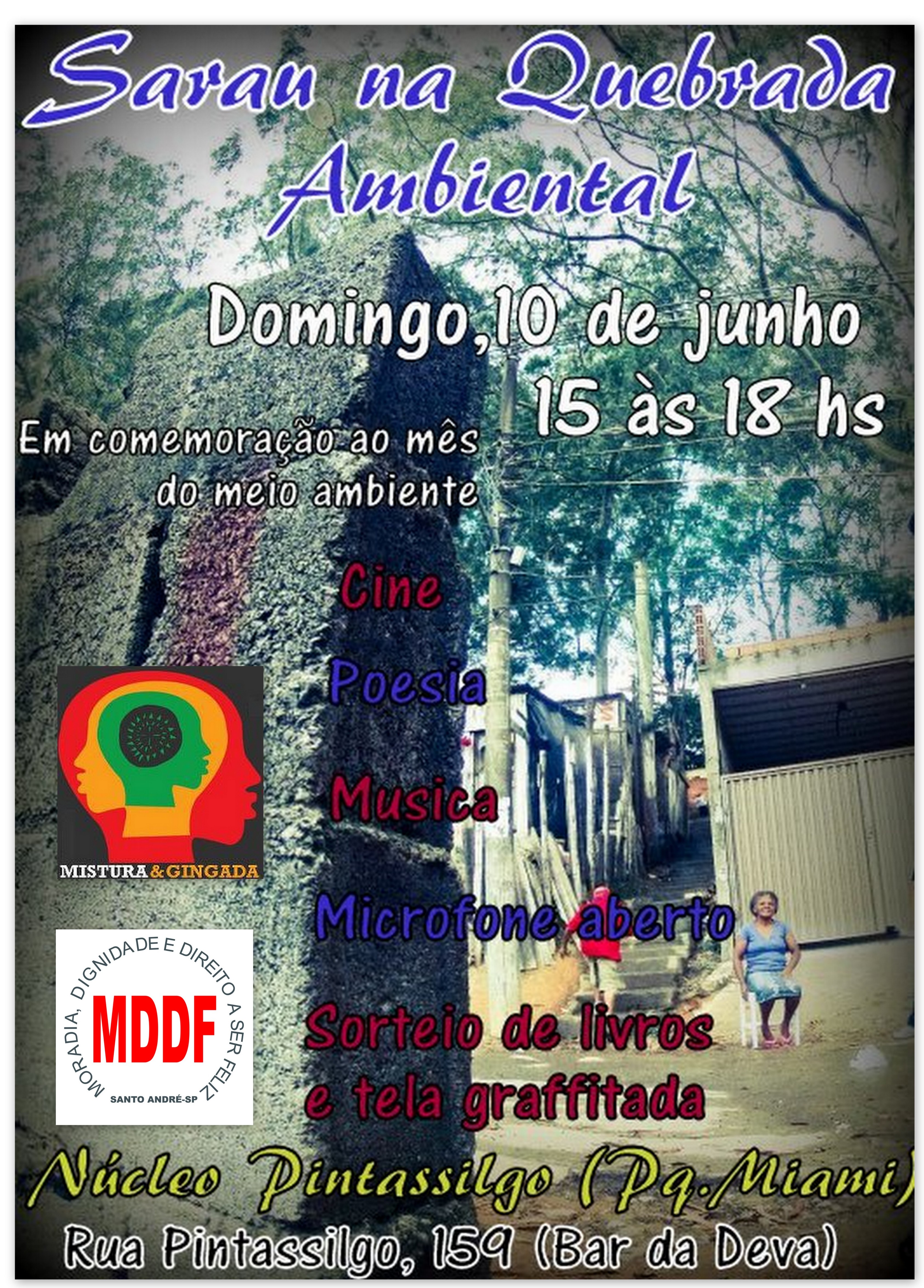O Ponto de Cultura Mistura & Gingada e o MDDF – Movimento de Defesa dos Direitos dos Moradores em Favelas realizarão neste domingo, 10 de junho o Sarau na Quebrada Ambiental no Núcleo Pintassilgo – Santo André, em comemoração ao Mês do Meio Ambiente.